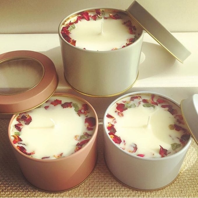 自然由来の大豆ワックスの中に、バラの花びらをたっぷりと散りばめました。 火を灯すとローズの香りが優しく広がります。 缶に入っているため、旅行やお出かけ等に気軽に持っていけます♪ ススも出にくく自然に優しいキャンドルです。